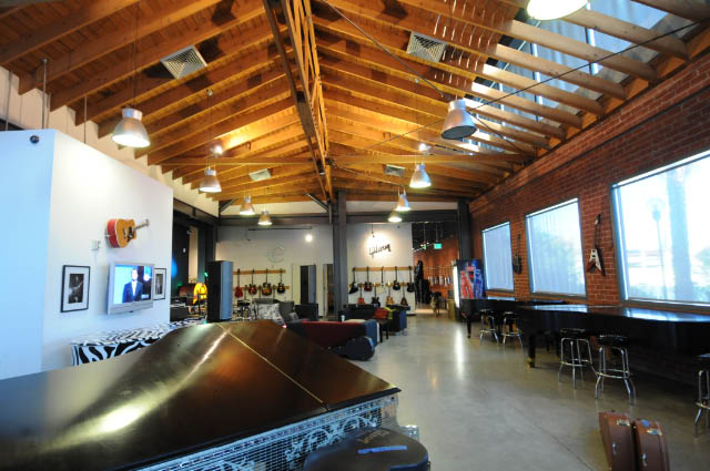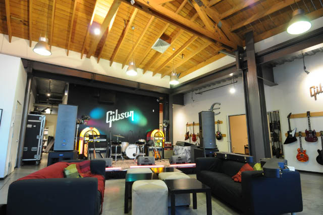 This old turn of the century retro building in Beverly Hills, houses Gibson Guitar show room and corporate offices. The concrete floors, steel beam and rough wood trussed ceilings bring an open creative vibe to this amazing space. Contrasting finishes, colors and texture open your mind to something from the past with a new crisp feel. A live sound stage, acoustically engineered recording rooms, private practice rooms and offices surround and complement the main show room.