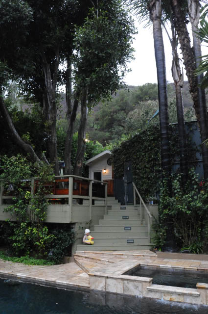 Lighted stairs lead to tree house deck with fire pit seating and home office and out door dinning.   Pool area and stairs